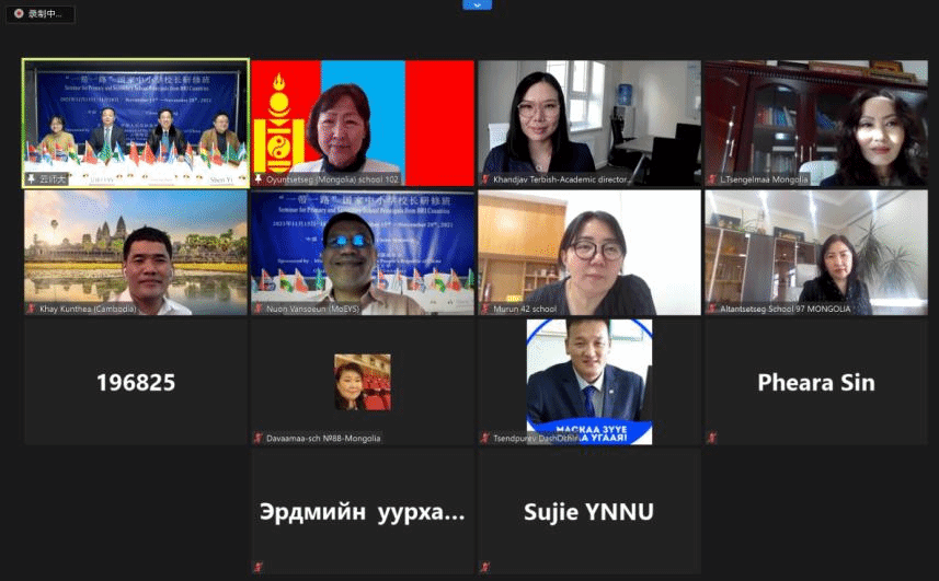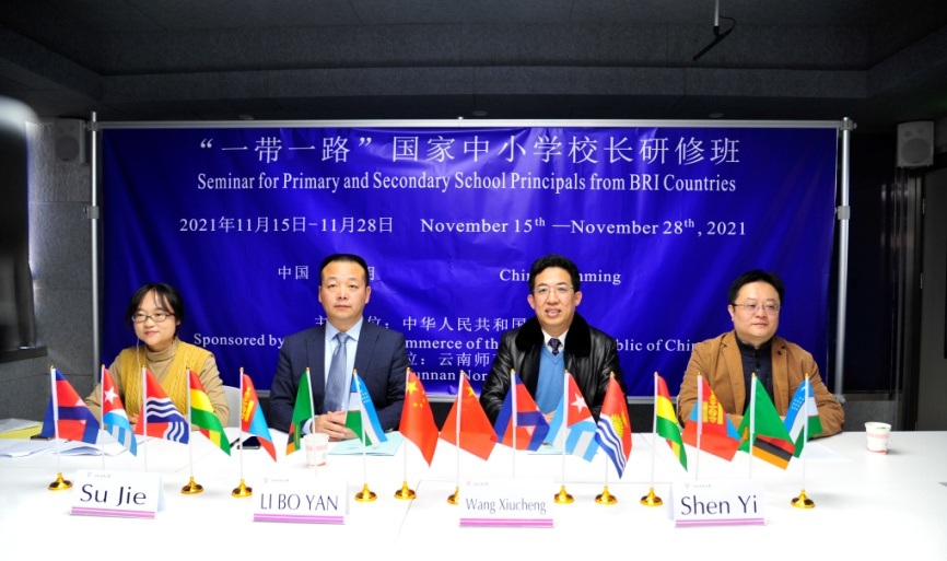 11月15日上午,由中国商务部主办,太阳成集团tyc33455cc官网承办,国际汉语教育学院具体实施的对外援助培训项目《“一带一路”国家中小学校长研修班》开班仪式以线上直播方式顺利举行。云南省商务厅对外经济合作处李伯言调研员、太阳官网国际汉语教育学院院长王秀成和来自柬埔寨、古巴、基里巴斯、蒙古、赞比亚、加纳以及乌兹别克斯坦7个国家的44名校长学员共同出席了开班仪式。开班仪式由汉语国际推广师资培训基地(昆明)常务副主任沈毅主持。