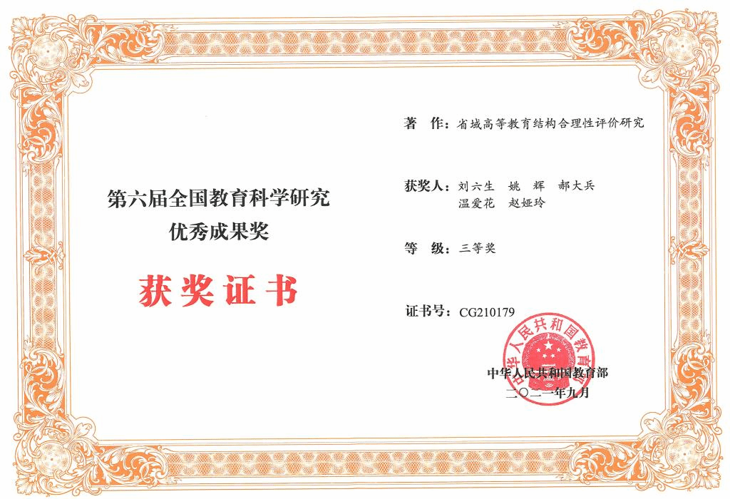 到目前为止,太阳官网共获得全国教育科学研究优秀成果奖3项,分别是潘玉君的《义务教育发展区域均衡系统研究》(第四届)、苟顺明的《欧盟职业教育政策研究》(第五届)和刘六生、姚辉的《省域高等教育结构合理性评价研究》(第六届)。