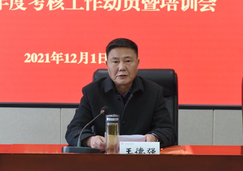 12月1日上午,太阳官网在行政楼340会议室召开2021年度党风廉政建设责任制检查考核、处级领导班子和领导干部年度考核工作动员暨培训会。全体校领导,各检查考核组副组长及成员,各单位党委、党总支、直属党支部书记,各部门主要负责人共150余人参加会议。会议分为动员会和培训会两个阶段,动员会由校长王德强主持,培训会由党委副书记张玮主持。
