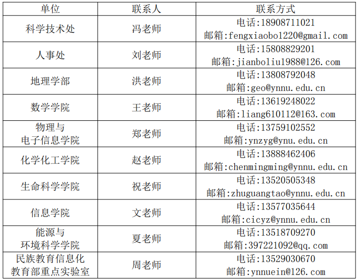 申请人请将个人详细简历(主要包括个人基本信息、学习经历、工作经历、研究方向及内容、所取得的主要学术成果等)等材料发送至科技处、人事处联系人或应聘学院联系人邮箱(见下方)。